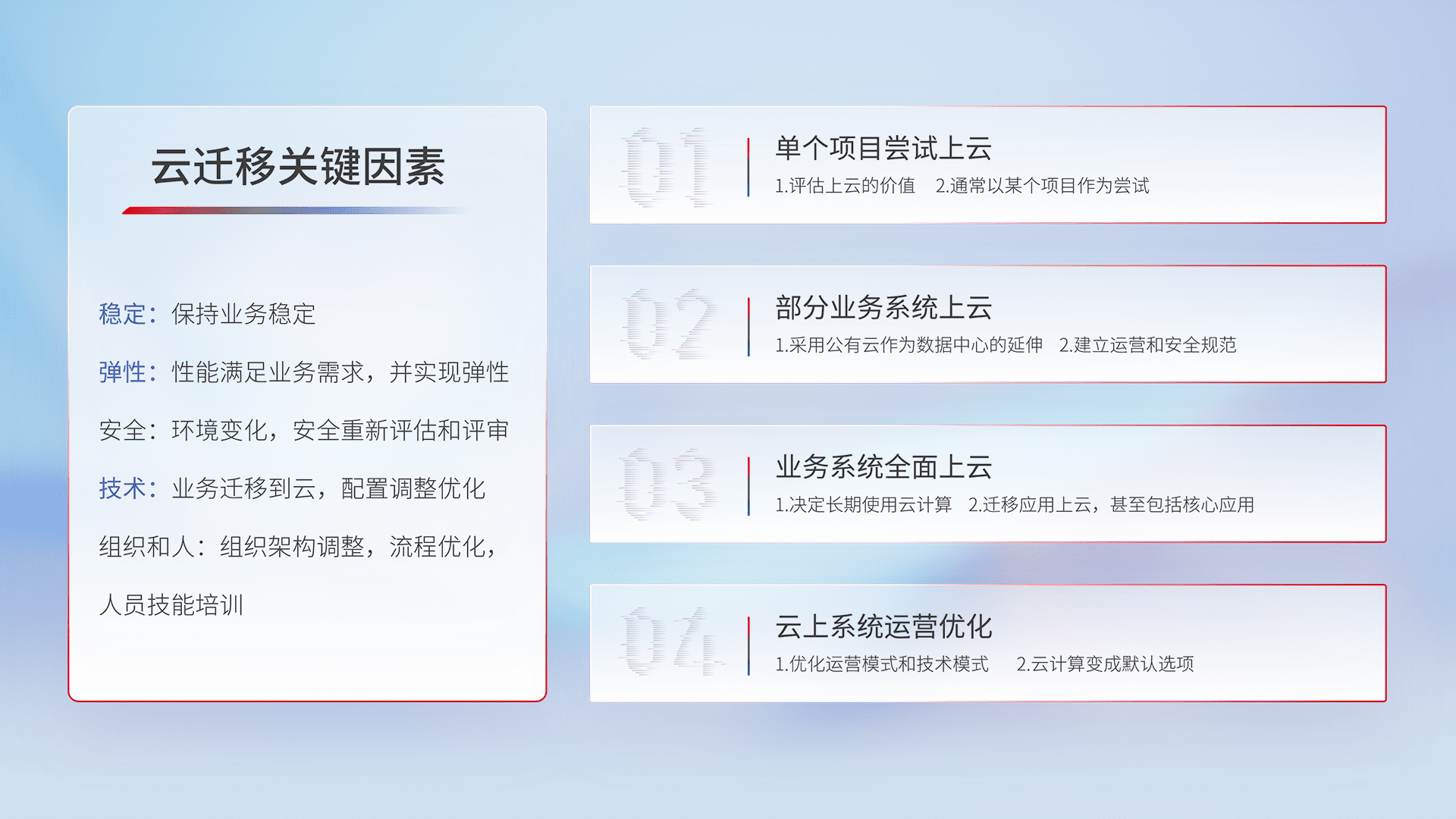 结合实际业务,,,从规划设计、、云平台选型、、、、云原生改造、、数据迁移、、、集成交付,,迁移全过程为客户识别最佳上云路径,,,做好风险识别管理,,设计网络架构、、、身份权限、、、安全审计合规、、操作审计、、、、日志审计、、监控告警策略、、、多站点容灾设计等,,,对云上基础设施进行整体规划,,提升IT治理水平,,,以满足弹性、、、、高可用、、高性能的需求。。