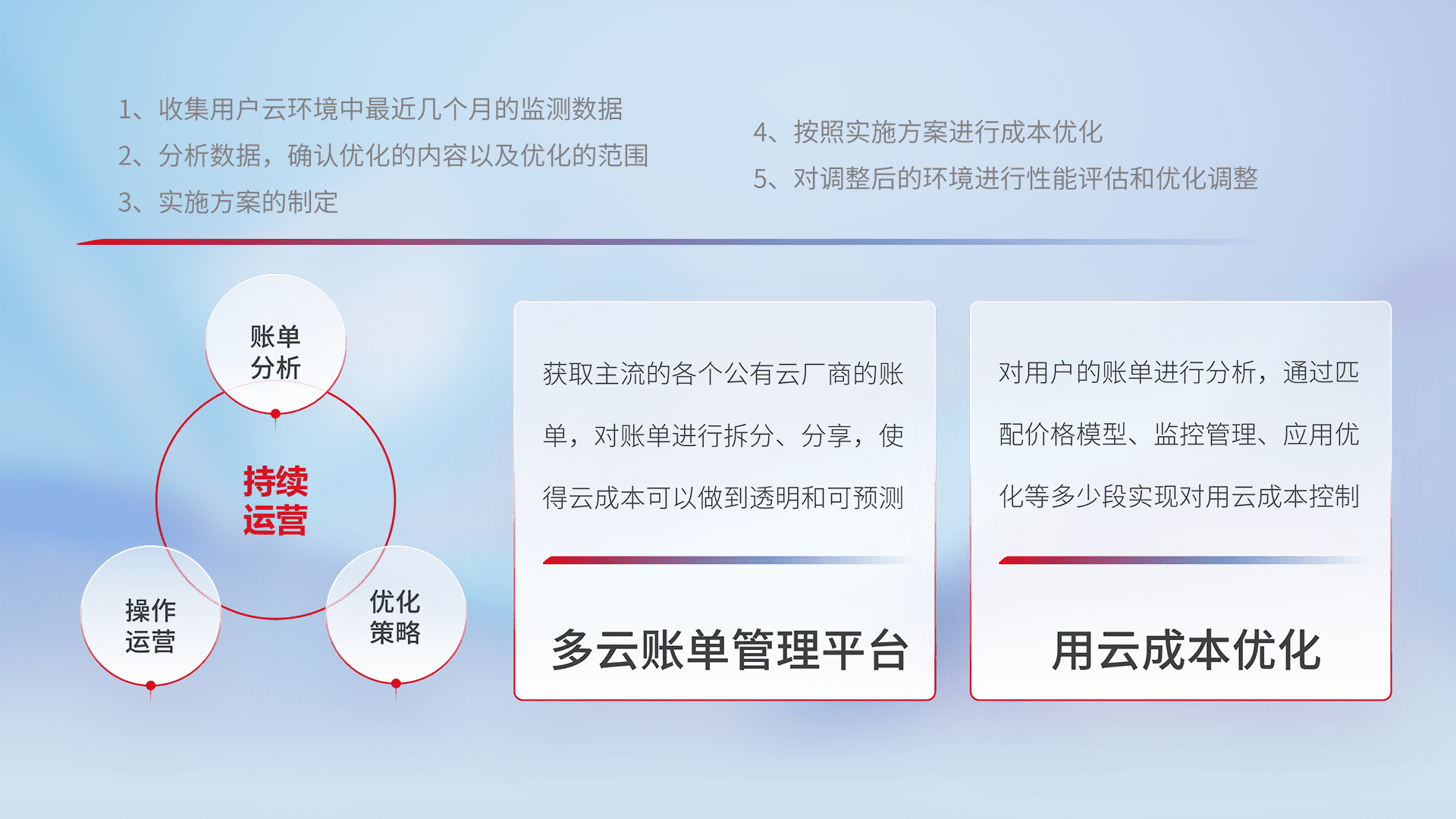 通过多云纳管,,,,以统一的资源数据模型把客户的云资源进行抽象和封装,,进而实现对多云资源的统一操作,,保障云资源管理的可靠性、、、、稳定性与可用性。。。量身定制化运维内容,,,,配置、、、、开发运维、、补丁管理、、、、备份、、、监控、、认证和访问管理、、审计和日常巡检等,,,,保障在用云过程中的可靠度,,稳定度以及高可用率。。